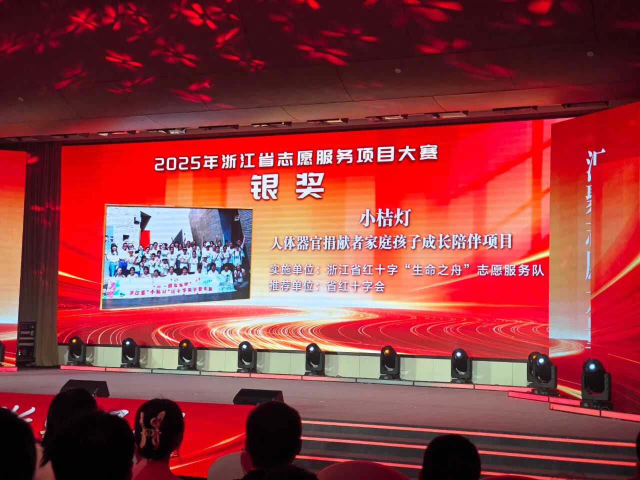 12月5日,2025年浙江省志愿服务项目大赛完赛,由我省红十字会推荐的小桔灯——人体器官捐献者家庭孩子成长陪伴项目荣获银奖。