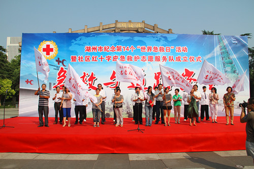 自2000年起,红十字会与红新月会国际联合会将每年9月的第二个星期六定为“世界急救日”,今年的9月14日是第14个“世界急救日”,主题是“急救与道路安全”。为了进一步推进红十字应急救护这一民生实事深入开展,普及应急救护知识和技能,提高广大公众自救互救意识,湖州市红十字会联合市文明办、团市委、市公安局、市卫生局和市交通运输局等部门在湖州举行第14个“世界急救日”纪念活动暨社区红十字应急救护志愿服务队成立仪式。副市长、市红十字会会长沈建平,市政府副秘书长、市红十字会副会长徐晏平等领导出席仪式,各主办单位、社区、医院志愿服务队以及公益组织团队代表共约300余人参加了此次活动。