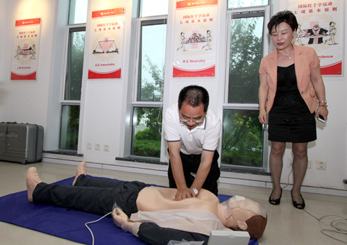 调研期间,金建新还饶有兴致地观看了市红十字志愿者应急救护演示,并亲自在模拟人身上进行了心肺复苏的实际操作。(潘熠)