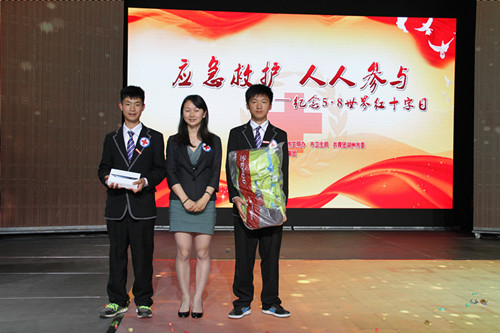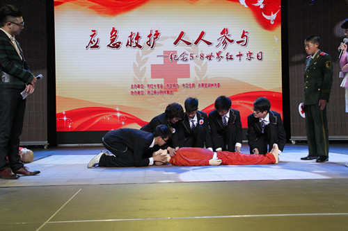 5月8日下午,湖州市红十字会联合市文明办、市卫生局、团市委于5月8日,在湖州电视台演播厅举行以“应急救护,人人参与”为主题的群众性现场应急救护知识竞赛活动,以此纪念世界红十字会创建150周年及第66个世界红十字日。湖州市红十字会各理事,湖州市、县区红十字会专职副会长、秘书长,各有关单位代表和社区群众等近200余人参加了活动。省红十字会专职副会长高翔,湖州市人大副主任方新旗,市政协副主席魏明,市委副秘书长沈昕耀,市政府副秘书长徐晏平等领导、浙江振兴阿祥集团总经理陈丽红出席活动。