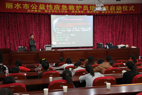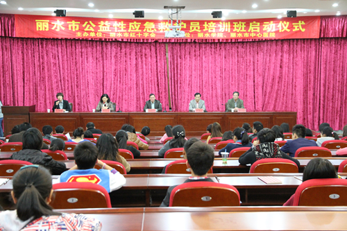 4月13日,丽水市2013年红十字公益性救护员培训班在丽水学院正式启动,本次活动由市红十字会主办,丽水学院和市中心医院协办,来自丽水学院60余名师生参加了首期应急救护员学习。市红十字会、市中心医院和丽水学院领导分别在启动仪式上作动员讲话。