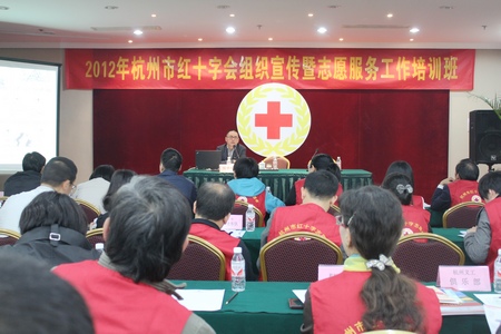 11月7日, 杭州市红十字会组织宣传暨志愿服务工作培训班在梅地亚宾馆举行。市红十字会党组书记、常务副会长唐奕出席开班仪式。市红十字会团体会员、志愿服务单位、各区、县(市)红十字会负责人及志愿者骨干60余人参加了培训。