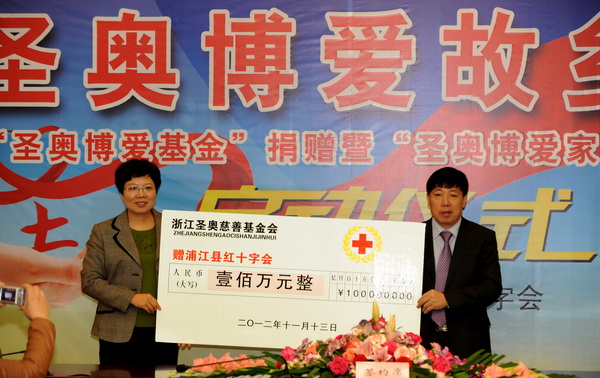 由浦江籍在杭爱心企业家倪良正先生创建的浙江圣奥慈善基金会向浦江县红十字会一次性捐赠人民币100万元,将用于县红十字会实施“圣奥博爱之家”项目。在两年内以春节前集中发放的形式用于岩头镇、杭坪镇、檀溪镇、前吴乡、花桥乡、虞宅乡、大畈乡、中余乡等8个山区乡镇助孤、助老和困难家庭的应急救助。