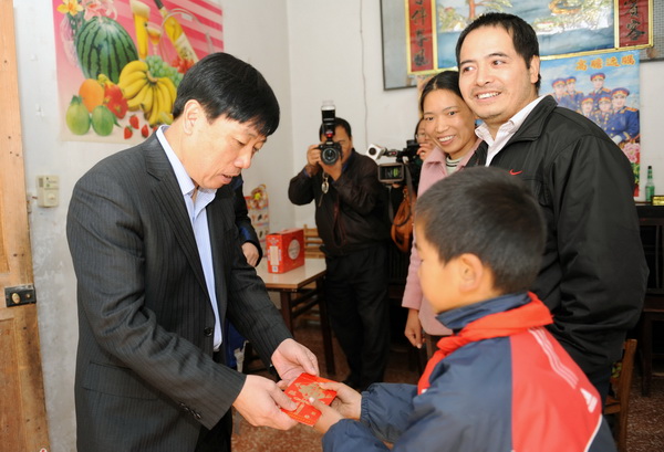 倪良正先生(左)亲手将助学金交给贫困儿童