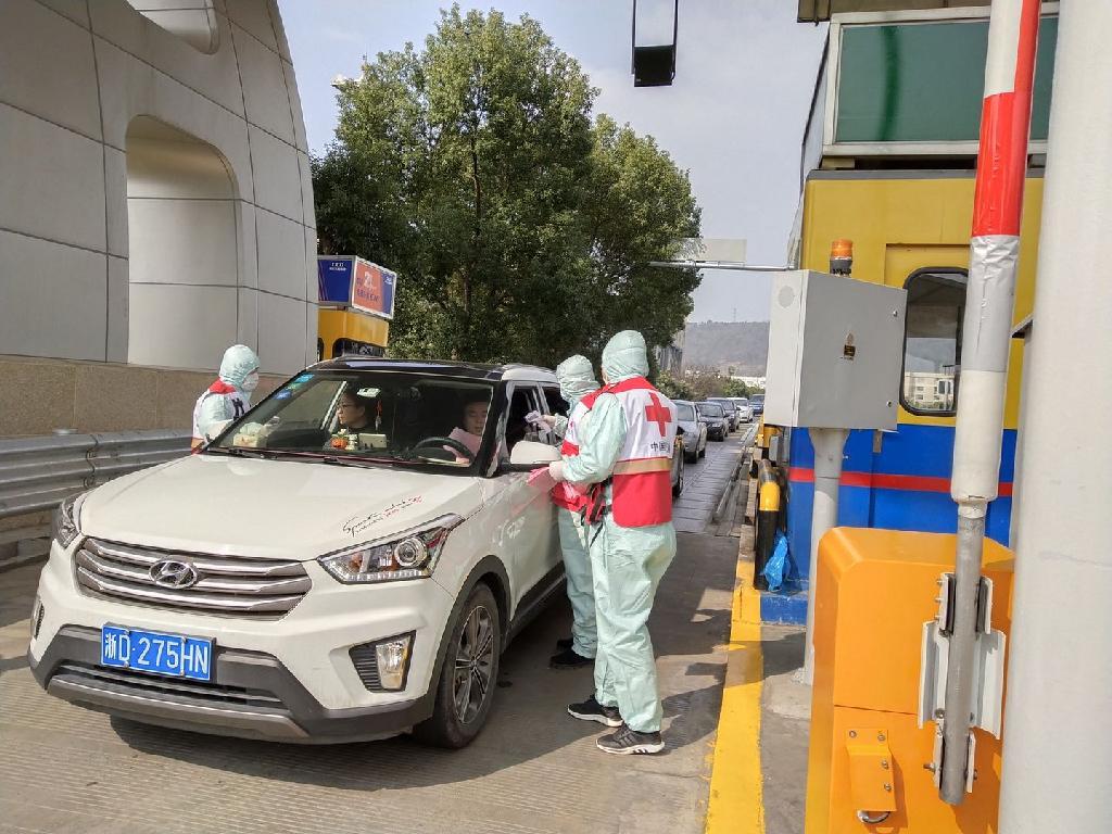 镜头四:新昌县红十字会派队员支援新昌高速道口、城南乡高速道口,多时段支援新昌高速道口、城南乡高速道口、双彩乡高速道口、沙溪镇高速道口,每日40人次轮班,新昌道口发放宣传单2000余份,24小时支援新昌高速道口,测量体温,发放宣传单。
