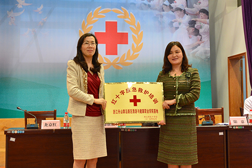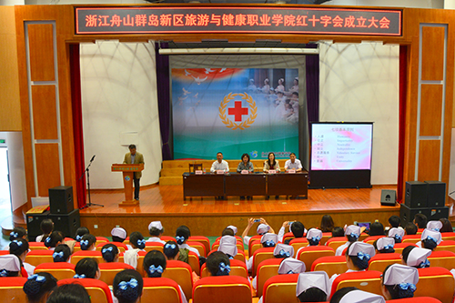 报告会前,举行了浙江舟山群岛新区旅游与健康职业学院红十字会成立大会,同时成立红十字志愿服务队和救护培训基地。市人大常委会副主任、市红十字会会长冯淑仙,市红十字会党组书记、常务副会长陆意等领导出席成立大会。冯会长在成立大会上讲话,要求浙江舟山群岛新区旅游与健康职业学院红十字会一要增强做好红十字会工作的责任感;二要结合学院实际开展具有特色的红十字活动;三要积极创建培育红十字志愿服务品牌。陆意常务副会长为学院红十字应急救护培训基地授牌红十字会,并向基地赠送了价值近两万元的救护培训教具。