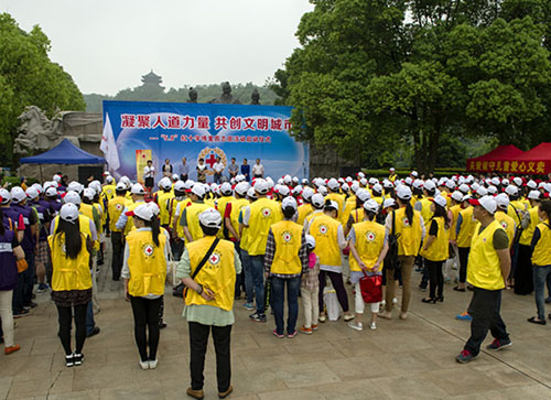 启动仪式通过诸暨市红十字会两位荣誉会员高军、翁利华的表彰拉开帷幕。诸暨市委常委、宣传部长杨元清为诸暨市红十字志愿服务总队授旗。在服务总队飘扬的旗帜下,253名志愿者集体宣誓,志愿加入诸暨市红十字志愿服务队,应急救援队队长沈云飞代表全体志愿者发出“凝聚人道力量,共创文明城市”倡议。