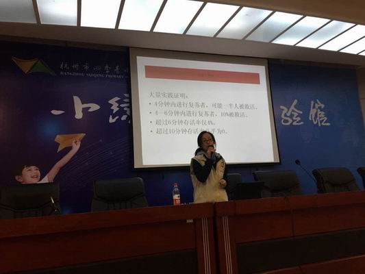红十字现场救护员教师培训专场分为三个环节,第一个环节是理论授课,区红十字会培训师资韩珏老师首先介绍了红十字事业的起源和发展历程;并重点讲解了昨天(4月23日傍晚)江干医生张赟在西湖边的利星购物广场抢救突发昏迷游客的案例,阐明了“人人学急救、急救为人人”的重要性,同时也详细讲解了心肺复苏、四大技术,使每一名教师都深受触动和启发。第二个环节是实践操作,学员们在5名师资们的耐心指导下进行了心肺复苏、手臂、头部、胸部包扎等专业性操作演练,每一位学员都学得认真,做得仔细;最后一个阶段即理论、操作考核。每位班主任学员都认真完成了答卷,并在专业老师的监督指导下进行了实践操作的考核,全部57名学员都顺利通过了考试,取得了红十字现场救护员证书。培训结束后,分管的校领导和其他老师对讲师团的认真敬业表达了深深谢意,并表示“这样的培训很重要,非常受用,以后万一发生学校意外伤害事件,我们老师心中就有了底。下次希望你们红十字还能为我们其他老师组织这样的培训。”