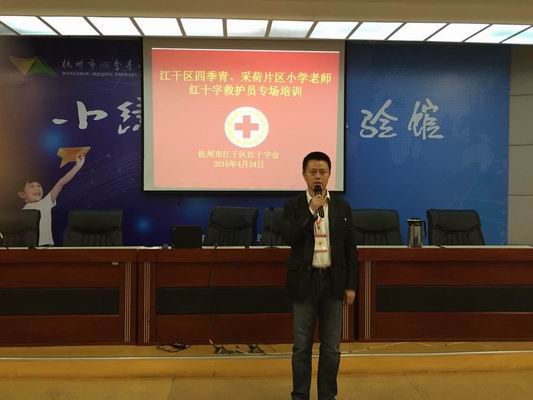 2014年3月起,江干区红十字会和江干区教育局在全市率先联合开展 “重点师资应急救护能力提升行动”,用两年的时间完成辖区全体1600名班主任和体育老师的红十字现场救护员培训工作,通过送教上门、点片联动培训、定期举办师资备课会等举措,将近期的性骚扰防范、公交出行安全等社会热点新闻第一时间加入到授课课件中,使得培训内容更接地气,让教师们“愿意听”、“听得懂”、“学得会”、“做得到”,为辖区中小学生构筑平安健康的“生命绿洲”。截止今年3月,辖区98%的体育老师和87%的班主任通过系统培训取得红十字现场救护员证书,红十字现场救护培训的品牌也得到越来越多教师的认可和肯定。