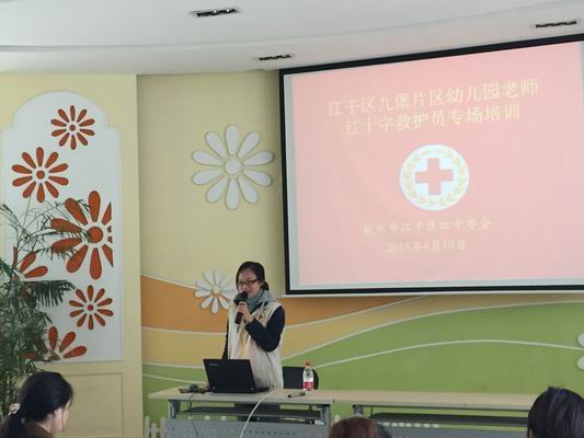 4月10日,江干区红十字会4月组织的第一场公益性应急救护知识技能培训在九堡街道东城第二幼儿园如此开班,来自九堡、彭埠街道22所幼儿用的83名幼教老师参加培训。