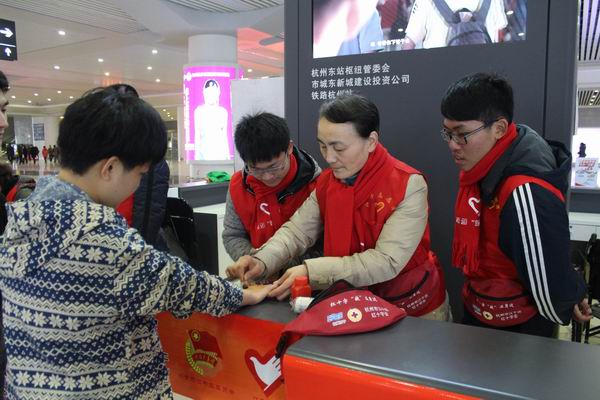 近期,杭州火车东站迎来了返程客流高峰,日最高客流量达20余万人次。江干区红十字会与共青团江干区委合作,通过骨干志愿者专场应急救护知识技能培训、开展“红十字送福送平安”主题活动、为志愿者配备“急救腰带”等举措,提升志愿服务专业化水平。截止2月底,东站志愿者利用“红十字急救腰带”设备为68名受伤旅客进行第一时间的处理,助力旅客平安出行。