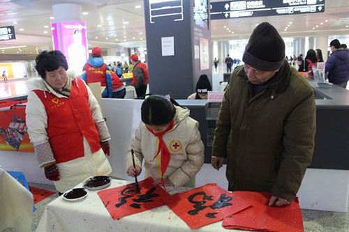 二是新春“福”字写一写。组织辖区学生、全国五一劳动奖章获得者、省市劳动模范及杭州市功勋志愿者参加杭州火车东站“红十字送福送平安”志愿活动,他们正在开展“红十字平安送福”主题志愿服务。红十字小志愿者们和其他优秀志愿者代表一道,将500份春联、家庭急救手册、餐巾纸、环保袋和来自江干区的祝福“打包”送至杭州火车东站的各个角落,向广大返乡旅客送去新春祝福和平安。