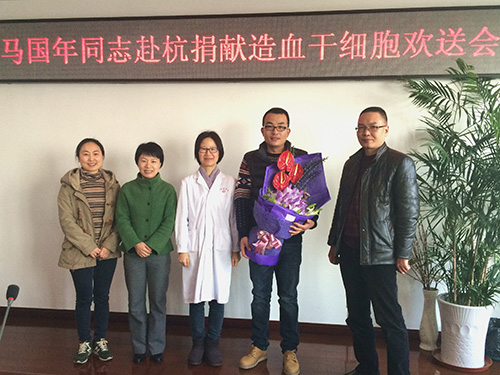 1月19日上午8点30分,宁波市北仑区中医院560会议室正在举行一场特殊的仪式——欢送本院医生马国年赴杭州捐献造血干细胞。区卫生局党委副书记、纪委书记张惠凤,区中医院副院长赵亚萍、严斌,区红十字会副秘书长李娟等一行为马国年送行。这是继北仑区妇幼保健院孙朝峰医生之后北仑又一名奉献大爱挽救白血病患者的白衣天使。