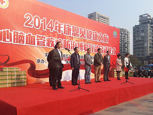 11月6日,浙江省红十字会2014年“康恩贝健康之旅——心脑血管疾病防治博爱行动”启动仪式在临安市人民广场举行。省红十字会专职副会长高翔,杭州市红十字会常务副会长周志明,临安市领导李赛文、楼国富、裘小民、张亚联,康恩贝集团有限公司总裁吴仲时出席活动。