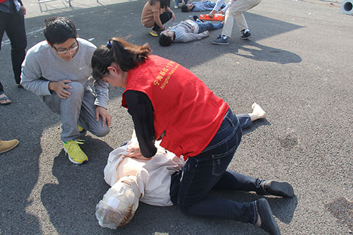 在现场险情排除后,红十字救护员们首先拨打120报警电话,告知具体情况。随后马上对伤者进行检查,确定一名危重伤员,心跳、呼吸停止,一名伤员腹部外伤及右胫腓骨骨折,另一名伤员则是颈椎骨折伴右胫腓骨骨折。然后,救护员们以其熟练的现场救护技能,对不同的伤员进行了现场救护。对这3名伤员实施呼吸球压力给氧、胸外按压、固定包扎等一系列紧急抢救措施。同时,还对3名伤员进行人文关怀,减轻受伤后的心理负担,并维持现场秩序。13分钟后,120赶到现场,救护员们协助医务人员将伤员抬上救护车送往附近的医院进行进一步治疗。救护员们熟练的技能和出色的表现,赢得了领导们的一致认可及周围群众的热烈掌声。