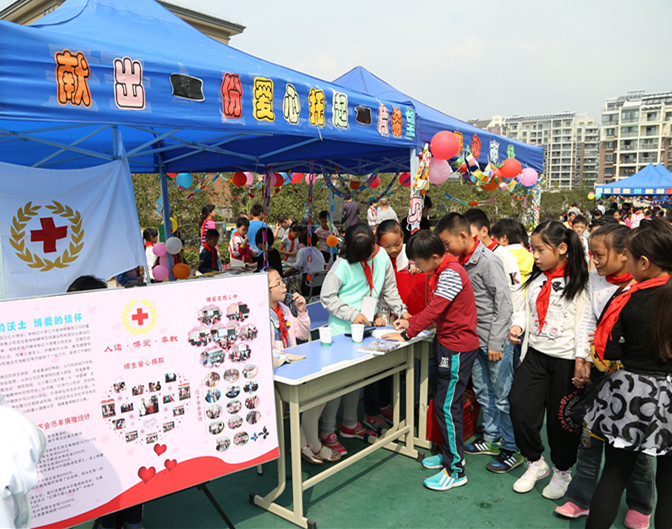 现场,摊位还真不少,“环保小屋”、“淘淘乐”、“小鬼当家”、“爱心驿站”等等。会员们把家里的旧图书、文具、玩具等按物品的新旧程度重新标价,在跳蚤市场自由买卖。操场上各种充满童趣的小“商品”琳琅满目,创意的广告、热情的服务、低廉的价格吸引了许多“顾客”的目光。有的降价打折,有的买一送一,大家纷纷驻足选购自己喜爱的商品。“卖家”和“顾客”的欢笑声、叫卖声和讨价还价声此起彼伏。跳蚤市场秩序井然,可以看到“顾客”挑选货物的专注的神情,可以看到“卖家”热情的笑脸,可以看到老师们忙碌的身影。最后,会员们把本次6500多元义卖款统一注入学校红十字爱心基金会。一部分由学校分发到困难家庭学生手中,一部分用于敬老院慰问,让暖暖的爱心得到传递。