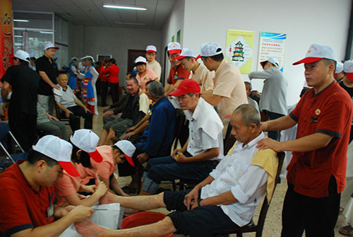 9:00,重阳敬老红十字志愿服务活动全面开始。舞台正中越剧、京剧、折子戏、歌舞等节目精彩纷呈,让老人们如痴如醉,直呼过瘾。在节目表演间隙,红十字志愿者还为福利中心的10位90岁高龄的长寿老人集体祝寿送匾;来自市人民医院医院心血管科、内科、呼吸科的主任医生们悉心倾听老人们的病情,针对病情提出最佳治疗方案,让老人们感受到专家级的服务;来自沈园堂足浴的近10名志愿者为老人们洗脚按摩,让这些从未进入过这些高档场所的老年人,享受了一次贵宾式的服务;来自香寨推拿的志愿者,听说有这样一个敬老志愿服务,主动跟主办单位联系,表达想参加活动,为老人服务的心愿。老人们坐在椅子上享受着志愿者专业的推拿,甚是惬意;来自柯桥8203发艺设计室3名红十字志愿者上午7:00就从柯桥坐公交车赶到福利中心,专门为老人们来义务理发。近3个小时,3名志愿者顾不上喝水休息,一刻不停的为20多名老人理发修面,忙的不亦乐乎。