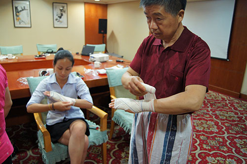 服务队队员吕美良是浙江省红十字会救护培训师资。当天,吕师傅用通俗易懂的语言,深入浅出地向其他队员们介绍了心肺复苏术、触电、烫伤等急救知识。队员们认真听取了理论知识,并且现场学习了心肺复苏术、创伤包扎。其中,队员王永富更是全家出动,带着妻子和女儿一起参加活动,他说,“红十字会教的这个急救知识好,我想让家里人都学习一下,肯定能有一个人学得好。”