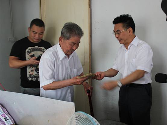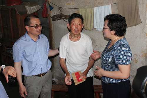 在慰问“三老”困难党员中,有一位94岁的老党员吴胜道,1946年就入了党,曾是一位老游击队员,解放后任藤桥乡第一任乡长,但是现在他双目失明,与子女生活在藤桥镇金马村的一简陋农房内,靠务农为生。孔海龙副市长上前搀扶着老人坐下,并将2000元慰问金送到老人手上,仔细询问老人的身体状况。