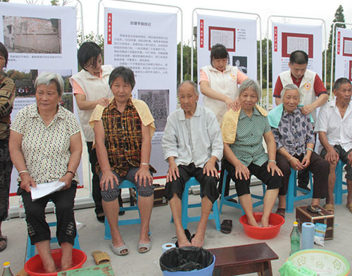 在红十字志愿服务活动区,来自市、区红十字会的爱心志愿者们为当地群众送来来急救技能现场示范、健康义诊、维修家电、免费理发以及洗脚推拿等贴心服务,受到村民们的热烈欢迎和一致好评。“师傅,你们按摩技术得可真好,我活了大半辈子了,洗这么舒服的脚真是头一次啊!”村民郑阿良笑开了怀。