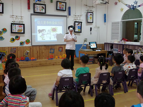 夏季是肠道传染病和病媒传染病的高发季节,为有效预防控制夏季传染病的发生和流行,江东区卫生监督所红十字志愿者充分发挥岗位职能,在加强对辖区内各医疗机构、学校等重点场所传染病防治检查的同时,加大传染病防控的宣传力度,以实际行动保障群众健康,弘扬人道、博爱、奉献精神。6月11日,该所红十字志愿者针对免疫功能相对低下的幼儿这一特殊人群,对中山幼儿园的小朋友上了一节关于幼儿夏季传染病预防的宣传课。