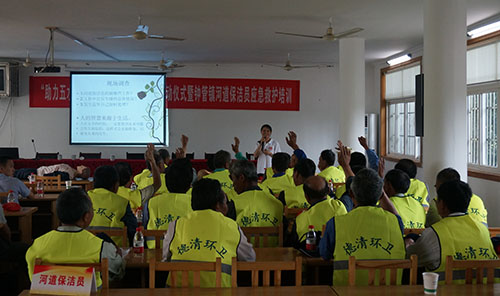 为组织开展好本次活动,前期德清县红十字会联合县五水共治办制定了《“助力五水共治 红十字在行动”活动实施方案》,明确了本次活动目标、内容与步骤。内容主要有三项。一是对一线河道保洁人员进行红十字应急救护普及培训,并配给相应的急救包等物品,增强一线河道保洁人员的自救互救能力,保障生产和生命安全。为了加强应急救护培训的针对性,德清县红十字会专门制作了针对河道保洁人员的课件,并召开师资会议进行了交流,针对一线河道保洁人员年龄普遍偏大等特点,确定了本次应急救护普及培训的内容为防溺水、防中暑、防蛇虫咬、意外受伤处理和心肺复苏,并要求统一用乡镇当地语言进行授课,以提高培训效果。二是号召广大的红十字志愿者参与到护水行动中来。加强对主要河道清理的整治、对河道内垃圾乱扔乱倒、污水随意排放等违法现象的举报和在河边乱搭乱建、乱扔垃圾、破坏水利设施等不文明现象的劝导。三是利用红十字平台,在志愿服务、红十字青少年、困难救助等活动中加强对护水节水知识的宣传,形成人人参与治水的良好氛围。