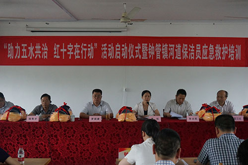 5月30日下午,德清县红十字会联合县五水共治办在钟管镇钟管村举行“助力五水共治 红十字在行动”活动启动仪式。县委副书记罗国建,副县长、县红十字会会长李红出席启动仪式。启动仪式上,李红副县长提出了3点希望,一是希望县红十字会以此次活动为契机,更多的服务中心工作。二是希望有关部门和乡镇密切配合,确保活动取得实效。三是希望广大河道保洁员认真学习急救知识,并应用到日常生活和工作中。启动仪式上县领导还向各乡镇(开发区)赠送了红十字物品(红十字急救包、T恤衫、太阳帽等),最后,罗书记宣布 “助力五水共治 红十字在行动”正式启动。启动仪式结束后,县红十字会对钟管镇河道保洁人员进行了应急救护培训。接下来,德清县红十字会还将花1个半月时间,对全县其余乡镇(开发区)的河道保洁人员进行应急救护普及培训。