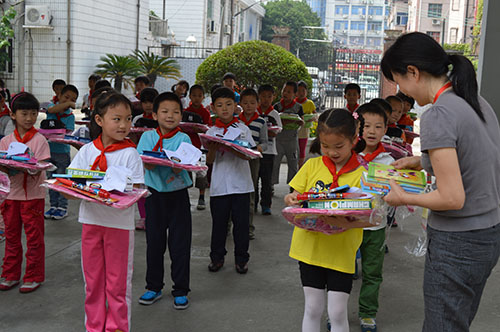 上午9时许,区红十字会工作人员将运送到学校的书包,文具套装、钢笔、太阳帽、拖鞋、乒乓球等价值75847元的学习生活体育用品发到了学生们的手中。秘书长刘优珍鼓励孩子们刻苦学习,长大了做一名建设祖国、回报社会的好青年。孩子们懂事地点头回应,并致以少先队礼。江东朝晖实验学校的马校长在感谢江东区红十字会为学生们带来社会关爱的同时,代表学校向区红十字会赠送了写着“善行千里 爱传天下”水晶杯。