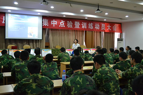 志愿者首先用图文并茂的PPT为民兵们讲述了中风、猝死、溺水、烧伤、气道梗塞等意外事件的处理方法,还针对战争时容易发生的伤害,为他们讲授止血、包扎、骨折的处理和搬运方法,民兵们对此类知识兴致勃勃。随后,志愿者用“真人模拟演练”的方法,教民兵们针对晕倒病人如何进行翻身、施救,激发了他们的学习兴趣。志愿者还用模拟人现场为民兵们演示如何开展心肺复苏术,志愿者风趣、生动的授课方法吸引了民兵们的眼球。最后,志愿者通过互动的方式,请民兵们上台来进行心肺复苏“演练”,民兵们个个摩拳擦掌,纷纷走上台进行应急救护“演练”,使课堂上学到的知识得到施展,将该次培训推向高潮。