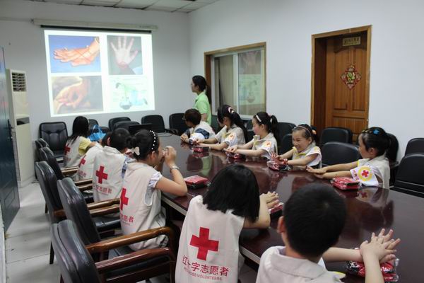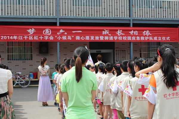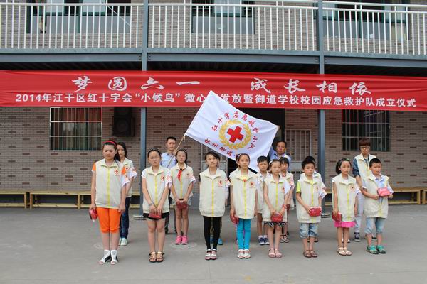 在发放仪式结束后,御道学校还成立了红十字校园救护队,来自各年级的16名学生首批加入了志愿服务队。来自御道学校的金校长说:“学校成立校园红十字应急救护队主要有两个目的,一是同学们作为意外伤害事件的第一目击者和第一施救者,能够在伤害发生的第一时间及时、正确施救,为专业医务人员赢得最宝贵的时间;第二让我们的小候鸟从小树立感恩社会、服务他人的理念,弘扬人道、博爱、奉献的红十字精神,助力小候鸟全面发展。”活动结束后,来自江干区红十字会的应急救护培训师资还为队员“开小灶”,集中教授了校园意外伤害的知识和技能。