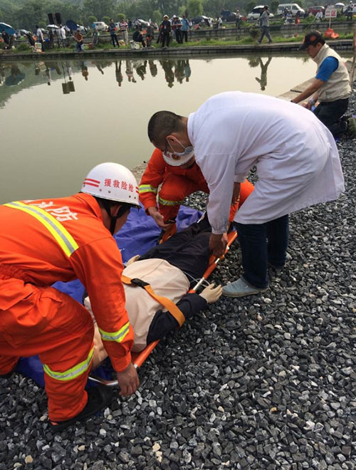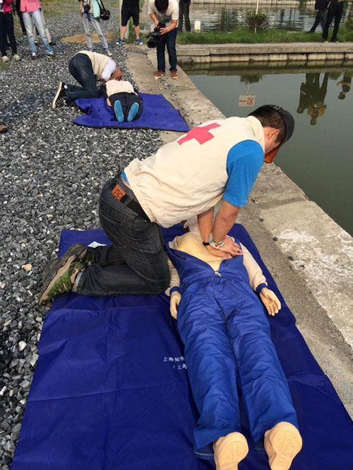 上午8时许,一阵急促的呼救声打破了村庄的宁静。在天目山镇藻溪村垂钓中心,钓鱼爱好者胡某不慎跌倒,迅速滑进水塘,垂钓中心工作人员发现险情后赶到,并大声呼救。循声赶来的王某见势不妙,立即跳水施救,谁想水情复杂救人失败,俩人挣扎向水塘中心漂去。参与演练的人员立即拨打了110和120,接到报警后,市巡特警大队水上救援应急分队迅速赶到现场,扔救生圈、从背后抱住落水者拖到岸边,两名“落水人员”被顺利救起。然而,此时“落水人员”已经没有呼吸,现场红十字志愿者立即实施了心肺复苏,最终抢救获得了成功。