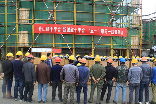 在“五一”劳动节即将到来之际,舟山市红十字会心系正在为建设美丽新区而辛勤付出的一线劳动者。4月25日上午,在市人大常委会副主任、市红十字会会长冯淑仙的带领下,市红十字会与新城红十字会工作人员一同来到舟山华康建设有限公司建筑工地,为他们送去了遮阳帽、球衣、劳保鞋等价值近6万元的慰问物资。冯会长亲手为工人们送上慰问品,并与他们交谈,询问他们的工作生活情况,祝愿他们在舟山能生活、工作得开心。此次“五一”慰问活动,市红十字会还将陆续送出价值5.3万元的物资,为一线劳动者们送去节日的问候和祝福。(吴英)