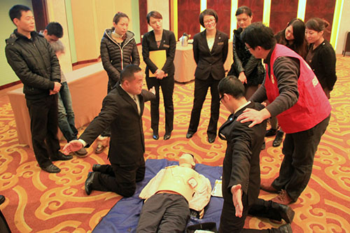 掌握应急救护知识技能的重要性众所周知,而对于人员聚集、流动性高的五星级酒店员工来说,更是必不可少的技能。绿城喜来登酒店作为舟山对外服务的主要窗口之一,具备现场救护技能、能为发生急症的宾客提供及时有效的帮助,对于提高服务质量、提升酒店品质将起到很大的促进作用。为保证培训质量,舟山市红十字会派出救护培训资深老师,为70余名员工进行现场应急救护基础知识、常见急症的现场应急救护、心肺复苏技能操作及创伤止血包扎等应急救护知识的培训,同时还为详细讲解并演示了体外自动除颤仪的操作使用。授课老师运用理论与实践相结合的方法讲解重要知识点,以确保所有参加培训的员工都能听得懂、看得明,达到学以致用的目的。现场的每位员工也听得十分认真、专注,在模拟练习的环节更是积极主动,踊跃参加模拟包扎、心肺复苏技术。很多员工表示,对这样的培训他们非常欢迎,并且希望有机会能够更加深入了解应急救护知识,掌握更多的自救互救技能,更好地为客人服务,树立舟山新区良好形象。