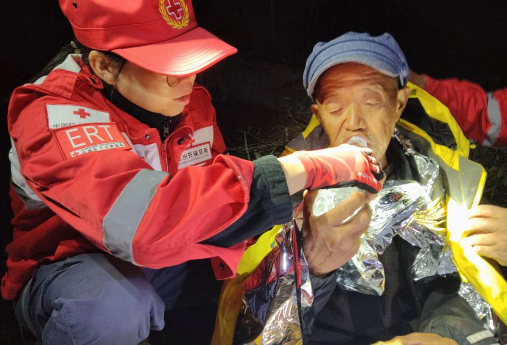 就在队员赶往航埠现场时,再次接到消息:郑某佬老人也已成功找到。队员们协同公安民警,在警犬带领的方向发现了倒在路上的老人,由于长时间行走未进食,老人身体虚弱、浑身发抖。在查看身体状况无碍后,队员为其送上蛋糕和水,并做好保暖,后将老人安全移交家属。