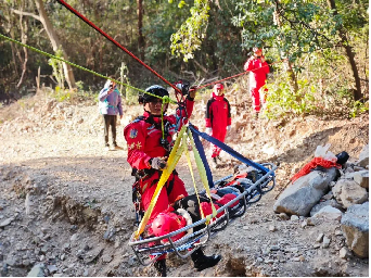 确定伤员位置后,队长李甬江迅速带领队员携带船型担架、急救包等专业设备赶往现场,并及时找到受伤人员。在完成初步伤情判断与肢体固定后,救援人员使用担架将伤员向山下转移。