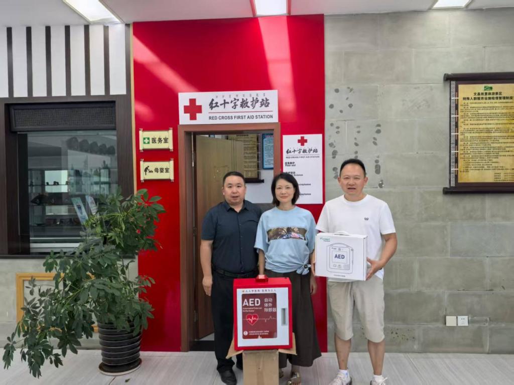 而在文昌故里水韵越西景区,醒目的白底红十字高高悬挂在游客服务中心的外墙上,全县首个红十字救护站在这里落成。站内AED、担架、急救箱、血压计、三角巾、绷带、云南白药气雾剂等急救设备与药品一应俱全,还设有休息区和急救知识宣传栏。