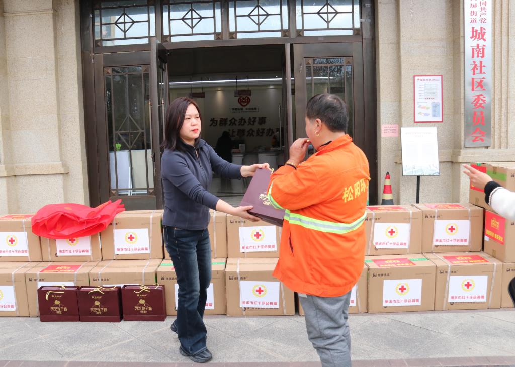 寒潮频袭,户外一线工作者与困难职工的健康防护牵动人心。近日,松阳县红十字会联合县总工会在城南社区开展“情暖一线群体,心系困难职工”慰问活动,向全县范围内环卫工人、停车收费员、外卖配送员及困难职工等群体发放灵芝孢子粉600份,为寒冬里的坚守者和困难人群送去健康关怀。