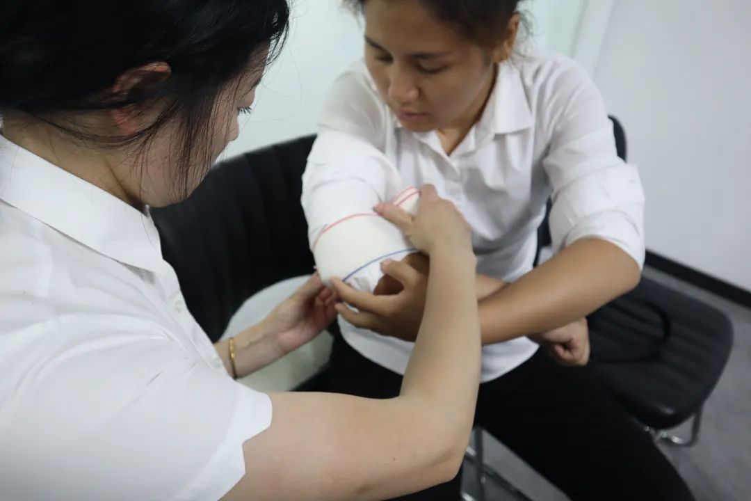 创伤救护培训环节围绕“创伤救护四项技术”(止血、包扎、固定、搬运)展开系统教学,并深入讲解了交通事故伤害的应急救护原则及现场检伤分类方法,帮助学员科学判断伤情、区分救治优先级。同时,课程涵盖了常见意外伤害的应急处置要点,进一步提升学员应对突发状况的能力。