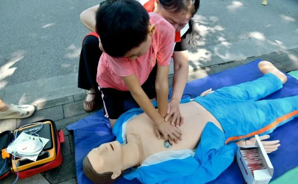 在讲解心肺复苏和AED的使用方法时,志愿者一边讲解理论,一边示范标准动作。大家跟着志愿者的节奏,纷纷伸出双手模拟操作,力求精准掌握每一个动作。老人们眼神专注,学得一丝不苟,仿佛回到了学生时代;孩子们则充满好奇,积极踊跃地参与互动,稚嫩的脸上满是认真。