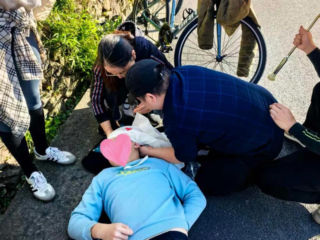 原来,16岁的小孙和父亲骑车下坡时失控摔倒,情况万分危急。周围路人虽已拨打120,却没人敢贸然施救。