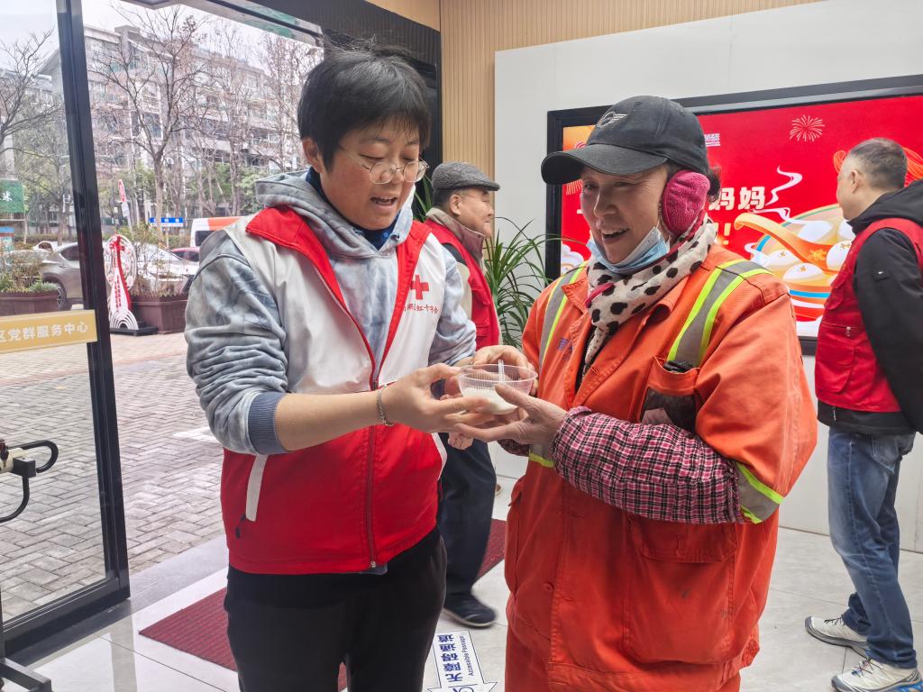新兴街道松鹤社区红十字会的志愿者将一碗碗热气腾腾的汤圆,亲手送到环卫工人、小区保安等一线岗位工作人员手中,在传递节日温暖的同时,生动践行“人道、博爱、奉献”的红十字精神。