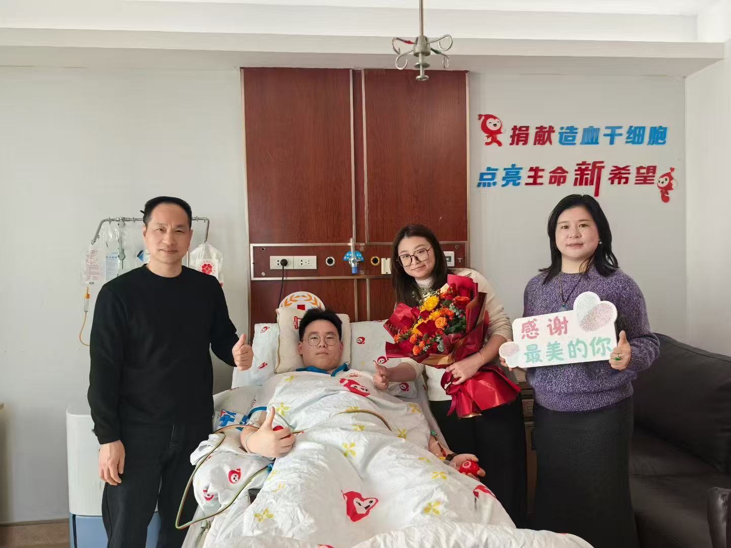 捐献当天,温暖相伴。诸暨市红十字会分管领导陈伟东前往浙江省中医院采集室看望杨小龙,送上鲜花并表达敬意与慰问,赞扬他无私奉献的善举。更令人感动的是,杨小龙的妻子始终坚定支持他的决定,并在捐献当天全程陪伴,给予他精神支持。家人的理解与陪伴,为这场生命接力增添了温情。