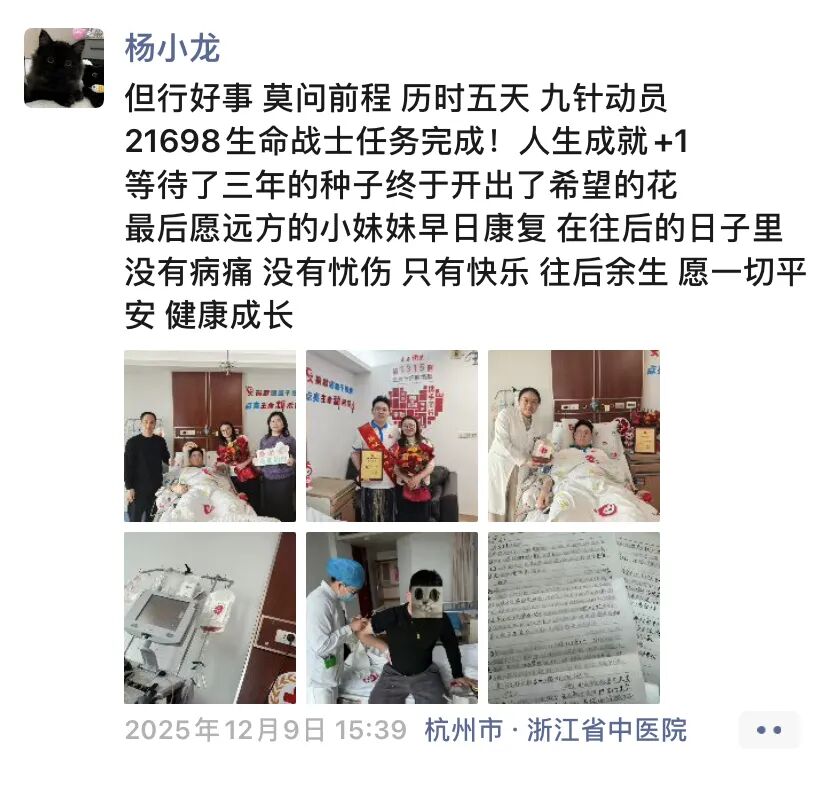 当长达数小时的采集顺利完成,杨小龙在朋友圈平静地写道:“但行好事,莫问前程。历时五天,九针动员,21698生命战士任务完成!人生成就+1,等待了三年的种子终于开出了希望的花。愿远方的小妹妹早日康复,在往后的日子里没有病痛,没有忧伤,只有快乐,往后余生,愿一切平安健康成长。”这些话背后,是一位退役军人和丈夫深沉的爱与担当。