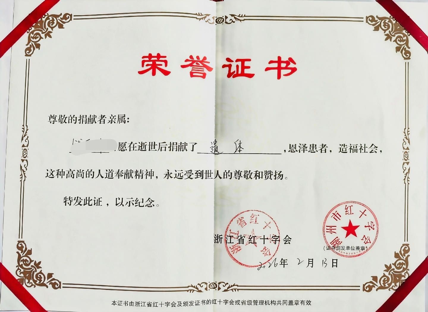 2月13日,湖州的钱女士安详离世,享年85岁。遵照其生前遗愿,在湖州市红十字会工作人员及志愿者的见证下,家属将她的遗体郑重地捐献给浙江大学医学院,用于医学教育和科学研究。
