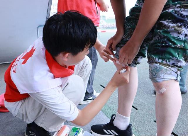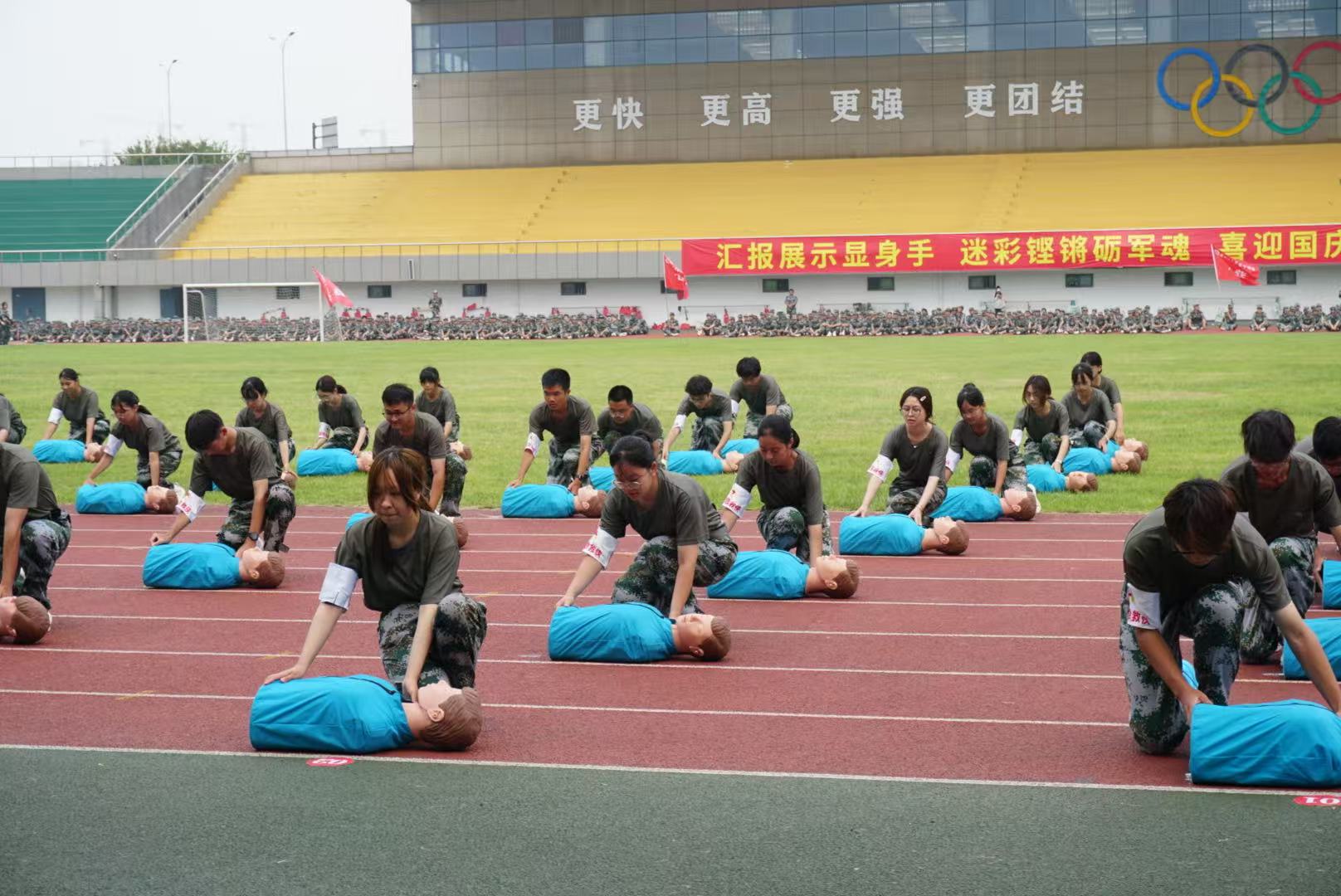 在新生军训汇报表演暨总结表彰大会上,该校医学院还组建了一支战地救护方阵,百名大学生统一着装,佩戴“红十字救护员”袖章,现场演示心肺复苏、止血包扎、固定搬运等应急救护科目,用实际行动传播人道理念。