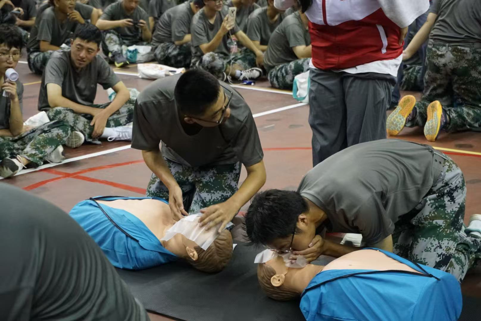 培训采取“线上+线下”相结合的模式实施。线上依托该校医学院开发的网络教学平台,上传应急救护精品微课,组织学生观看学习;线下在军训场地设置10余个培训点位,每个点位配备3名应急救护师和志愿者,确保实操训练高质量开展。