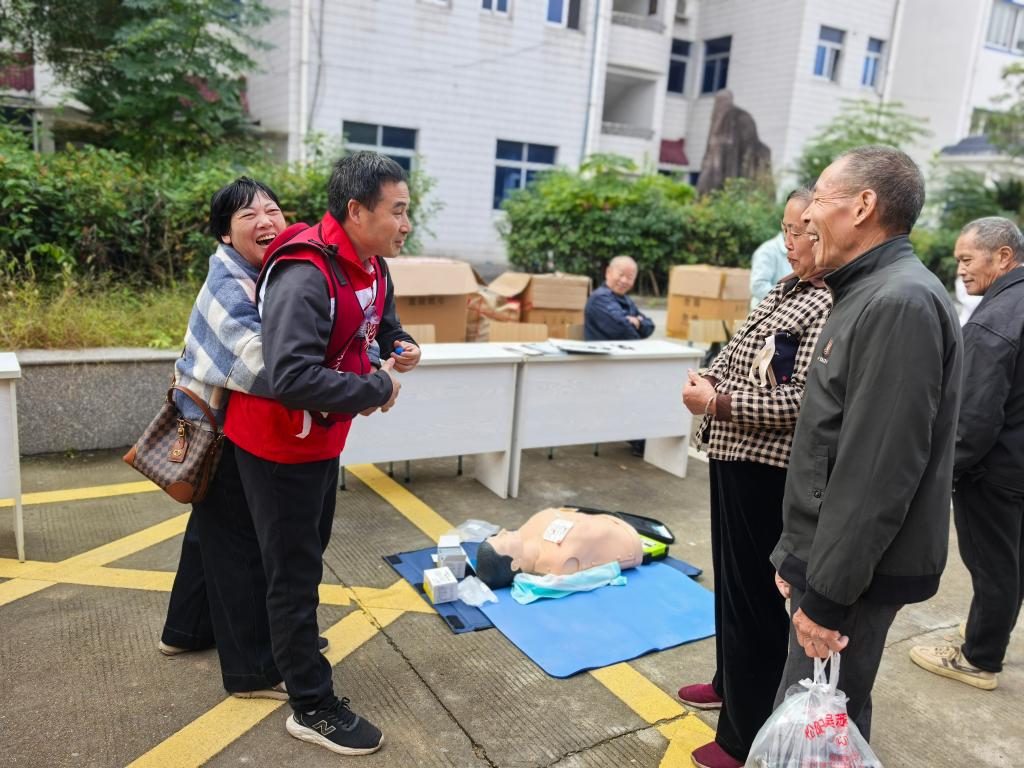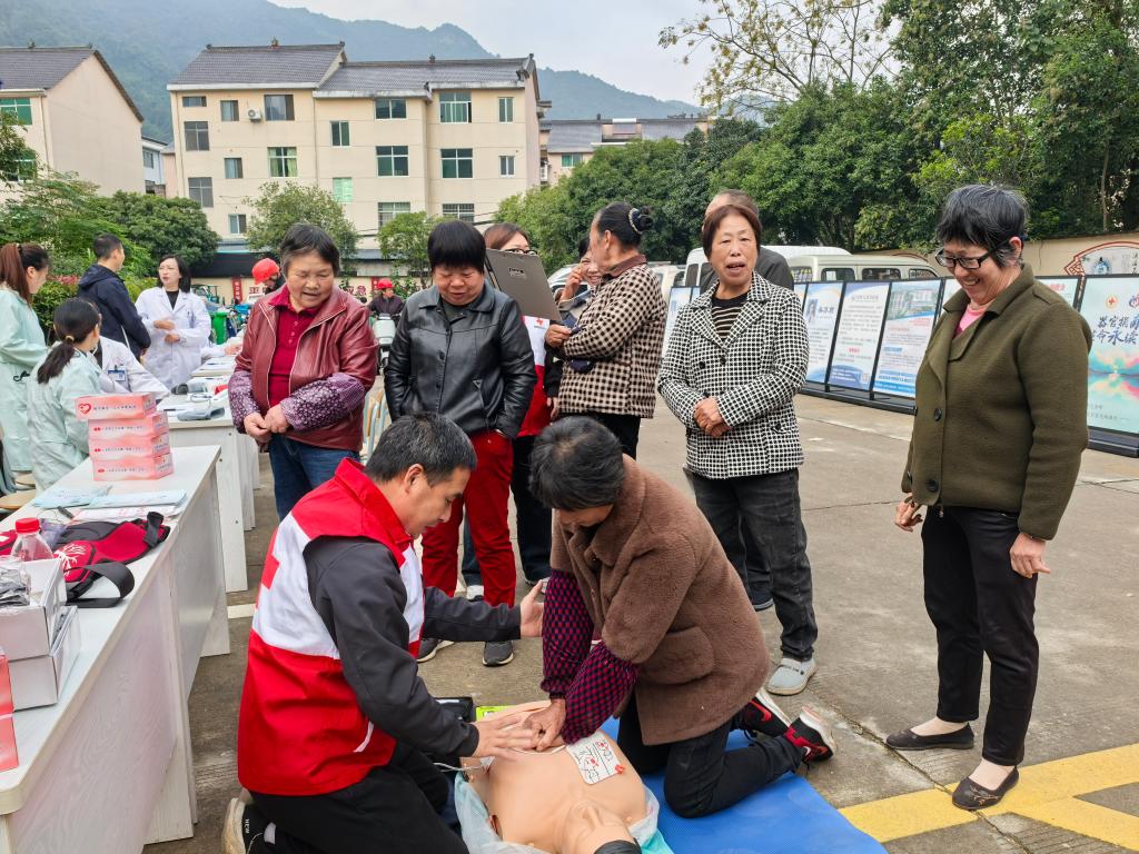 红十字应急救护师带来的“生命课堂”吸引了众多村民驻足。“发现有人突然倒地,没有反应也没有正常呼吸,我们首先要做什么?”应急救护师借助模拟人一边讲解一边演示心肺复苏的关键步骤——从判断意识到规范胸外按压,再到人工呼吸。村民们凝神观看,几位年长的村民更是主动上前,在应急救护师手把手的指导下进行实操练习。