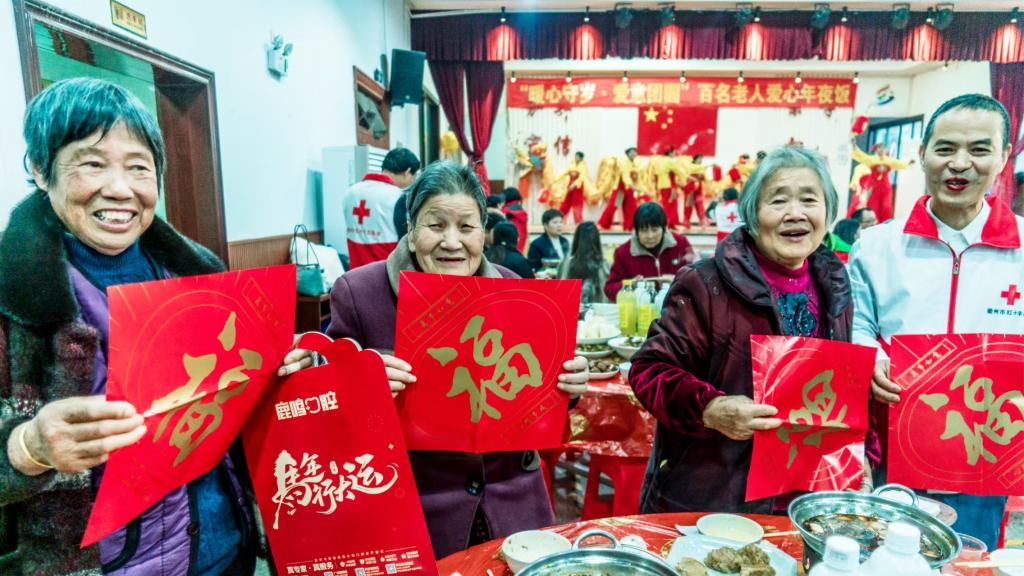 1月14日,衢州市衢江区方杨村锣鼓喧天、暖意融融,一场由衢州市红十字会志愿者参与的“暖心守岁・爱意团圆”爱心年夜饭热闹开席。志愿者们以实际行动传递温暖,让老人和环卫工人们在欢声笑语中提前感受到新春团圆的喜庆氛围。