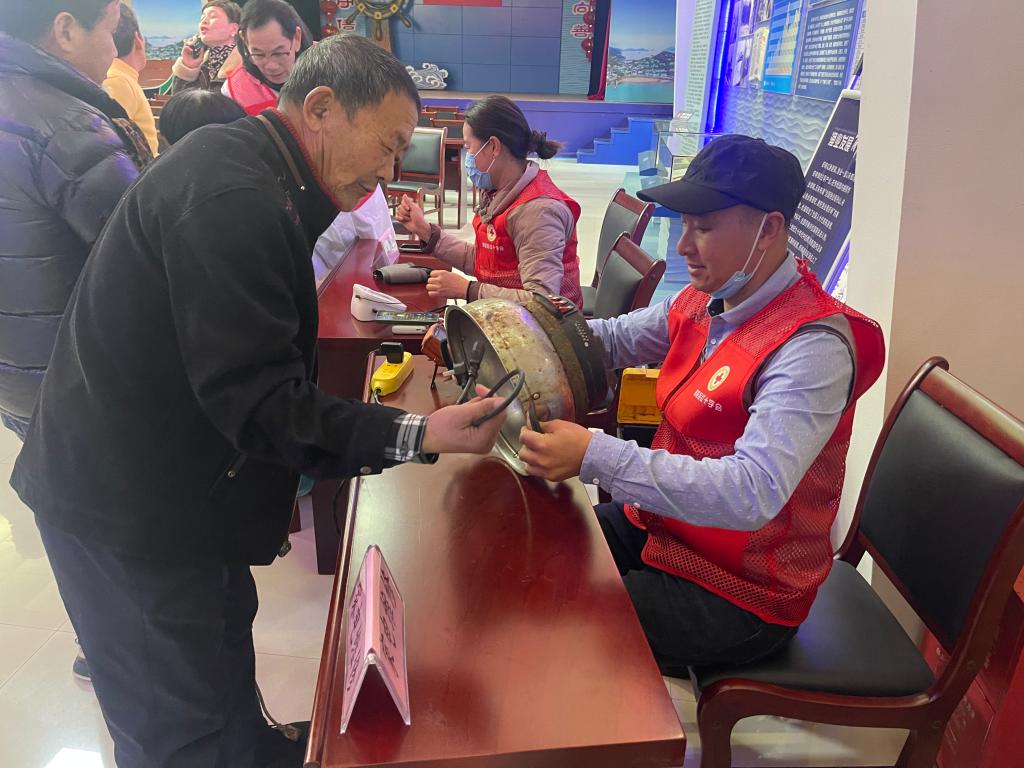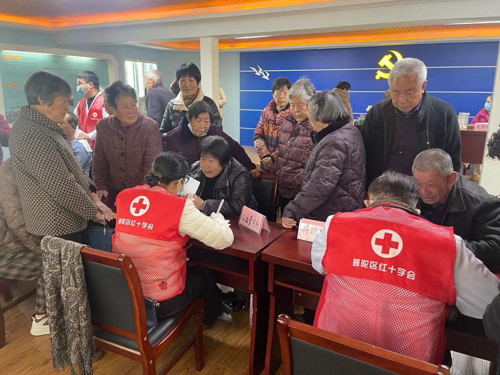 1月13日,舟山市普陀区红十字会老吾老志愿服务队走进虾峙镇东晓村河泥槽文化礼堂,为当地老年村民送医送药送服务。这是区红十字会新年首场志愿活动,当天吸引了周边三个村的百名老年人前来参加。