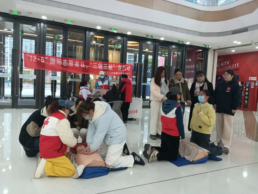 奉化区红十字会组织应急救护师、生命之光队队员及大学生志愿者,在奉化区万达广场开展“三救三献”主题宣传活动。